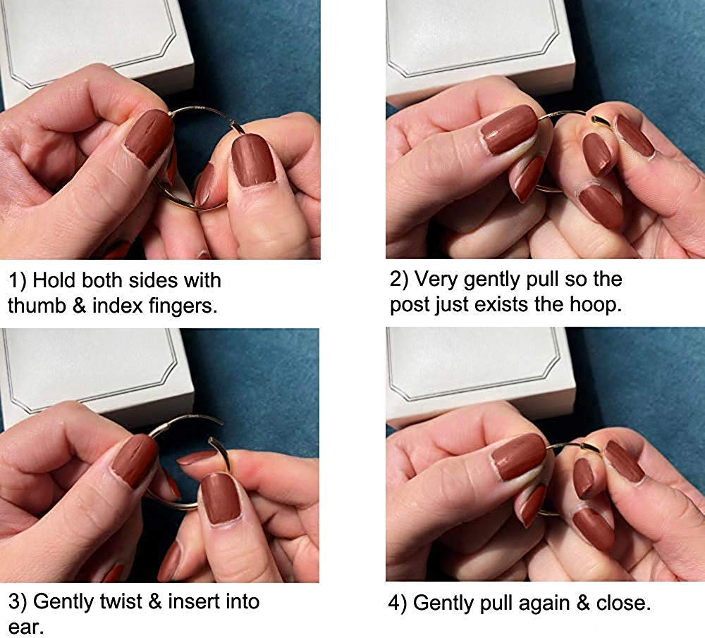 - ✦ HOW TO PUT THEM ON ✦ The easiest way to apply hoops is to hook the post to your ears from back-to-front, that way you can easily see where the solid post goes into the hoop