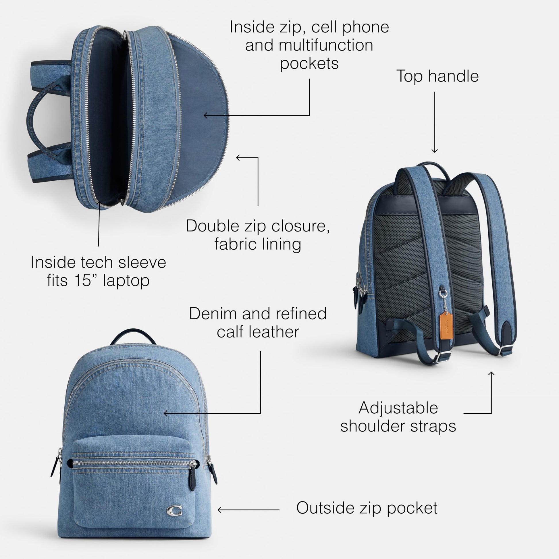 - Denim & Leather: The perfect pair. Crafted with denim and refined calf leather - for an iconic Coach backpack