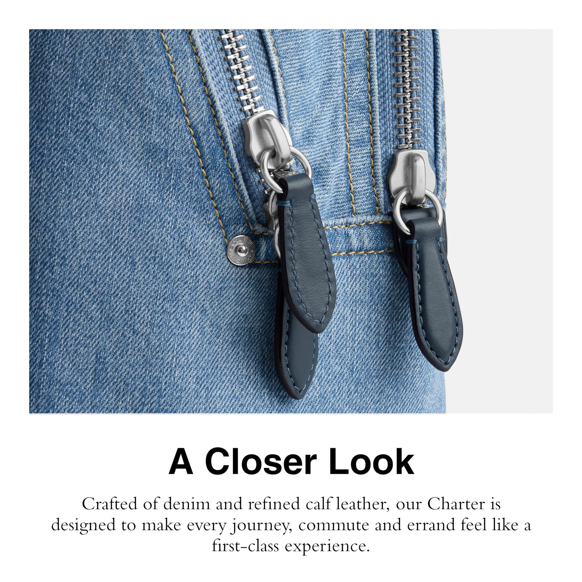 - Editor's Notes: For adventures near and far, our Charter denim backpack is designed to make every journey, commute and errand feel like a first-class experience