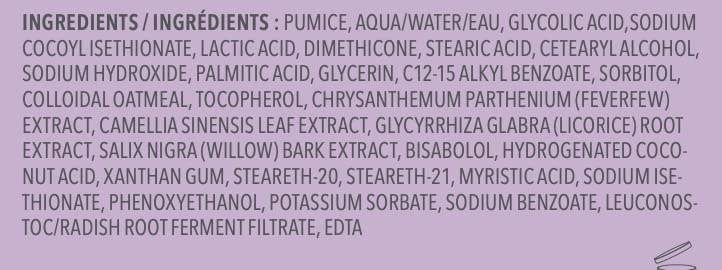 - Buff Away Dead Skin: Glycolic and Lactic Acids at a combined level of 10% help loosen skin’s top layer and decongest pores, while Pumice Buffing Beads (NOT microplastic!) whisk it all away