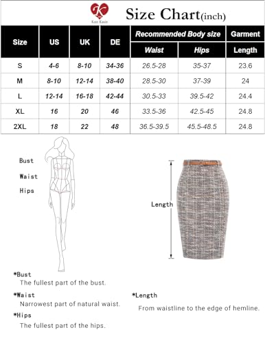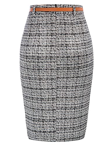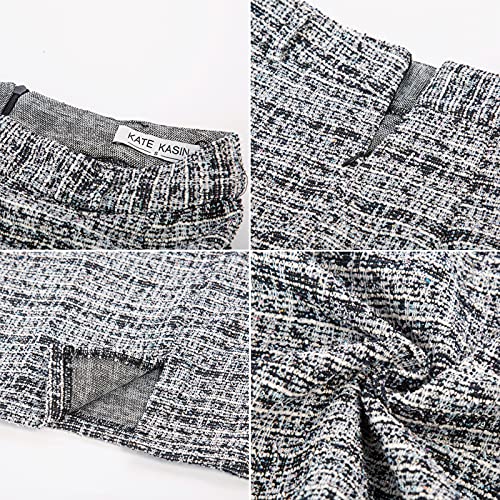 Kate Kasin Women's Knee Length Bodycon Tweed Pencil Skirt with Belt Hip-Wrapped Business Casual Split Skirts Black L