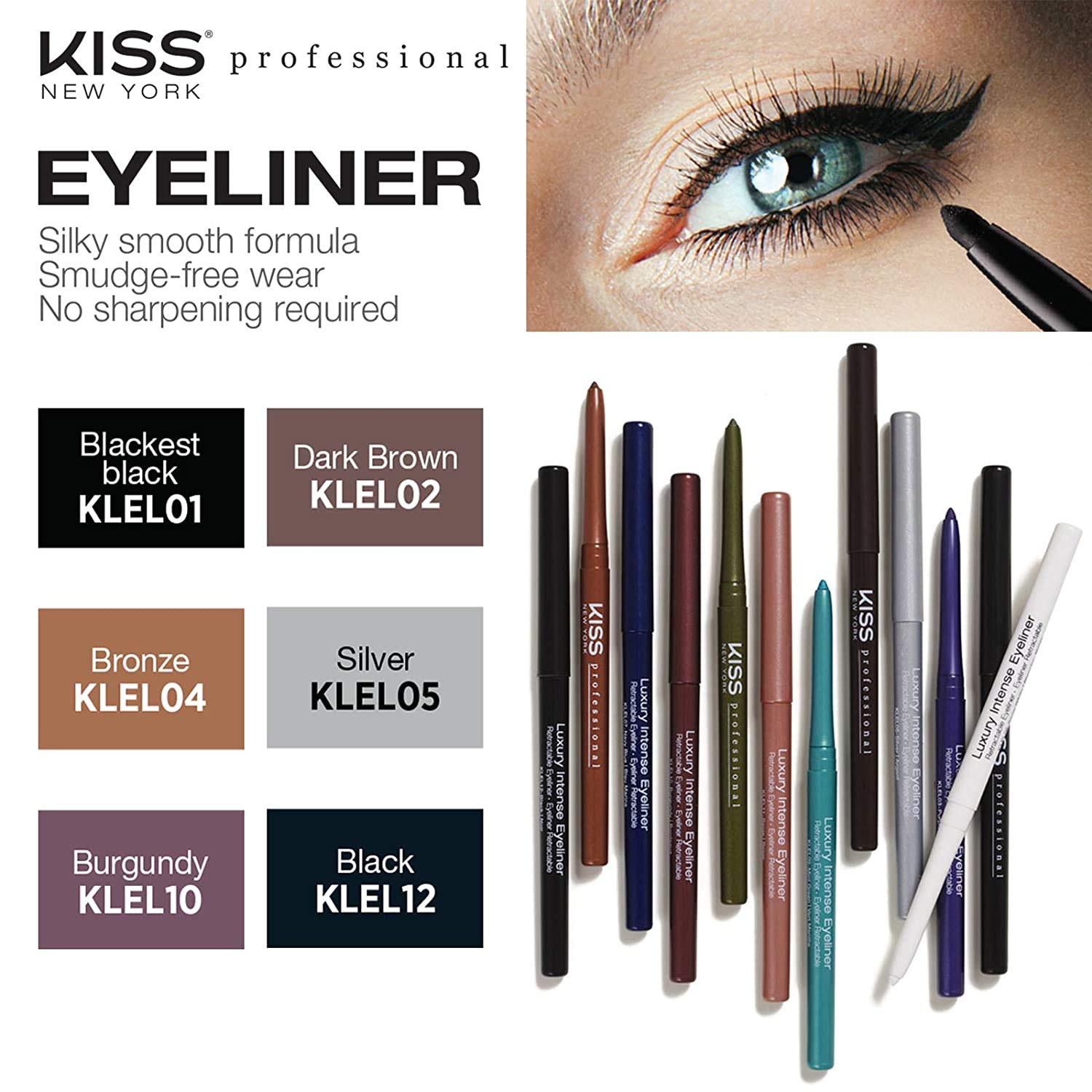 KISS New York Professional Retractable Eyeliner, Luxury Intense Highly Pigmented Eye Makeup, Long-Lasting, Water-Resistant, Smudge-Proof, Smooth Gliding (1 PACK, Blackest Black)