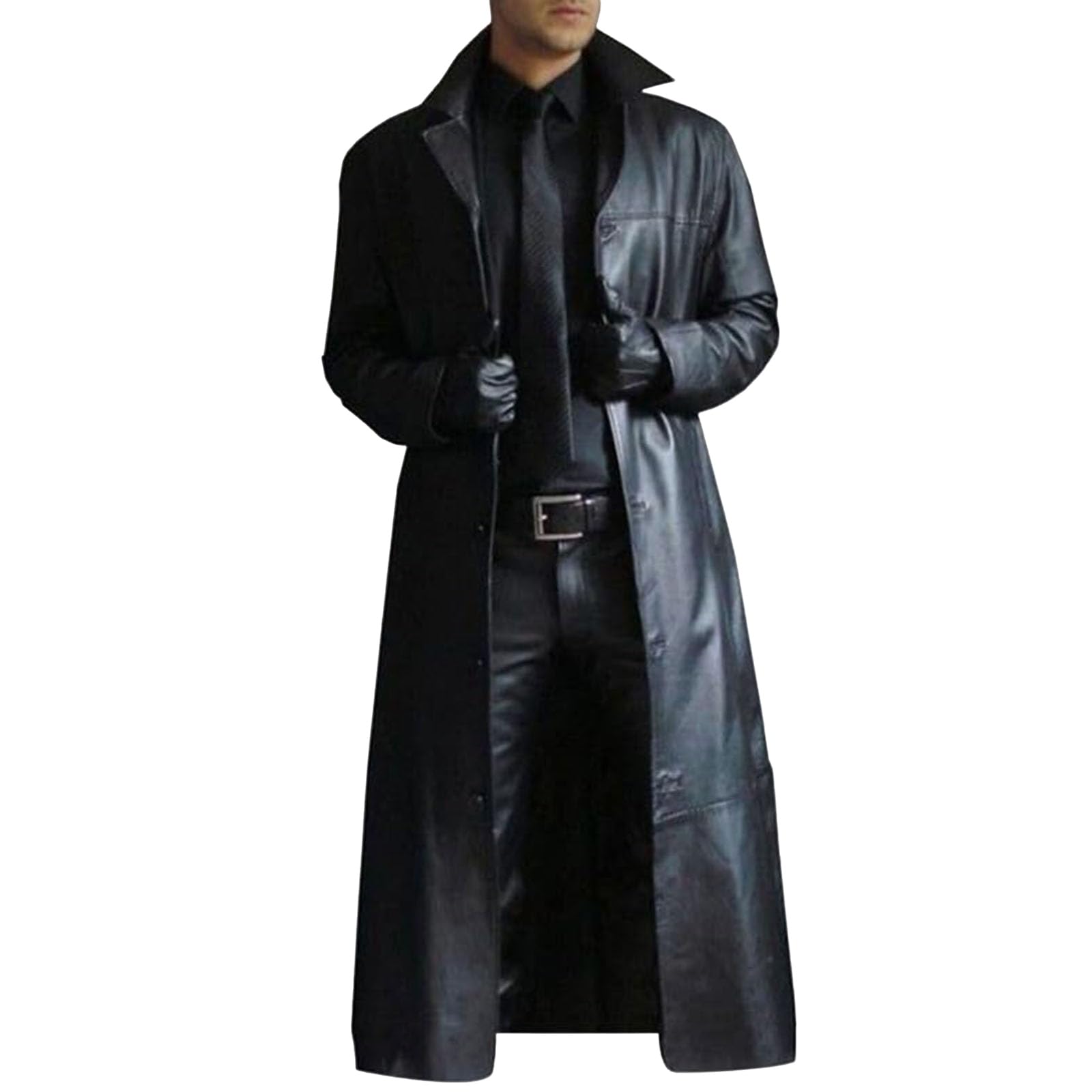 Mens Leather Trench Coat Full Length Vintage Classic Faux Leather Long Leather Jacket Winter Overcoat