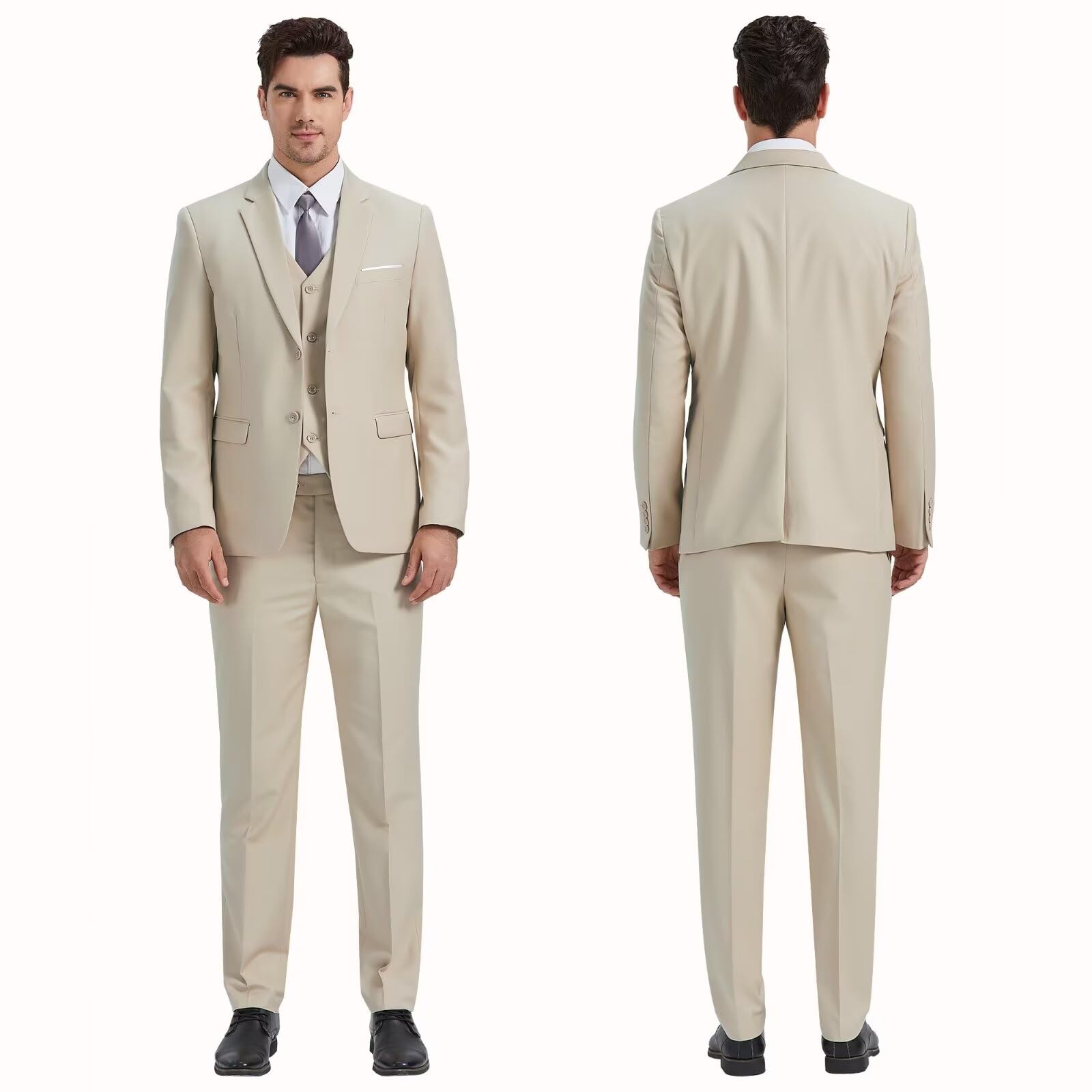 Men's Slim Fit 3 Pieces Suit, 2 Buttons Beige Blazer Vest Pants with Tie Set, Business Wedding Tuxedo M