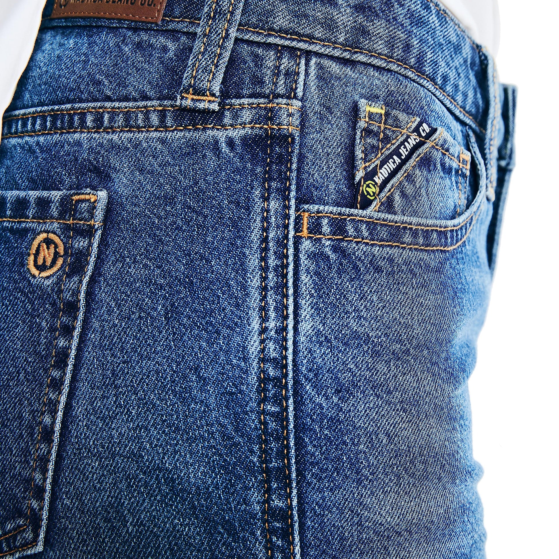 - Button-and-zip fly.