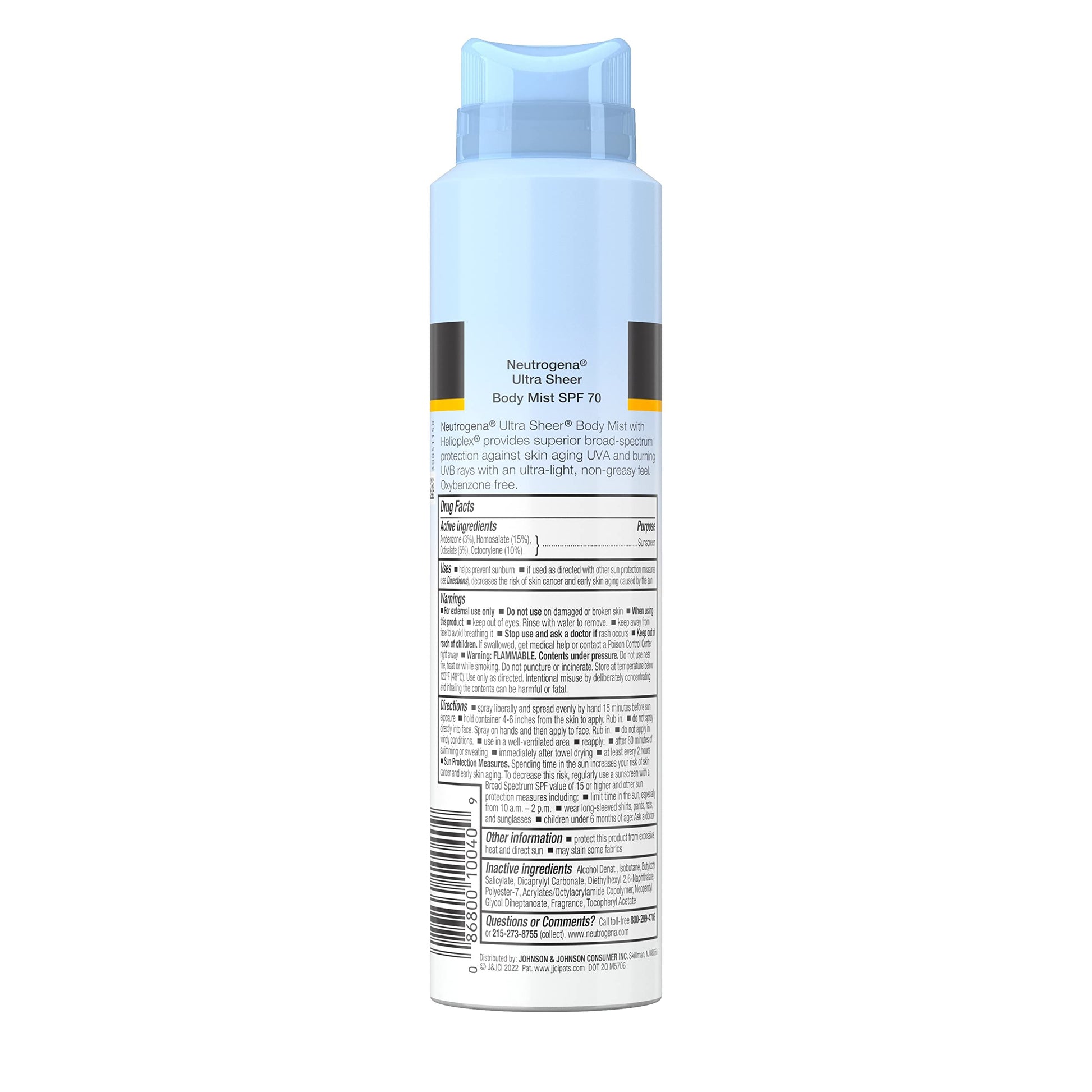 Details: Neutrogena Ultra Sheer Body Mist Sunscreen Spray with Broad Spectrum SPF 70 provides powerful sun protection that you will love to wear to help prevent sunburn. Made with Helioplex technology, this non-greasy sunscreen spray for body provides superior UVA/UVB protection in an easy-to-use spray format. The sunscreen spray formula also absorbs quickly with a sheer, lightweight finish and a weightless, clean feel. This SPF 70 sunscreen mist is non-comedogenic and oil-free, so it won't leave a heavy white residue or clog pores and, when used as directed, may decrease the risk of skin cancer caused by the sun. Convenient for on-the-go, the easy-to-use spray can provides no-mess application for the body. This spray sunscreen is water-resistant up to 80 minutes and comes from the #1 dermatologist recommended suncare brand. Apply prior to sun exposure to keep skin protected. New formula contains no oxybenzone and uses avobenzone, homosalate, octisalate and octocrylene for protection from UVA & UVB rays.