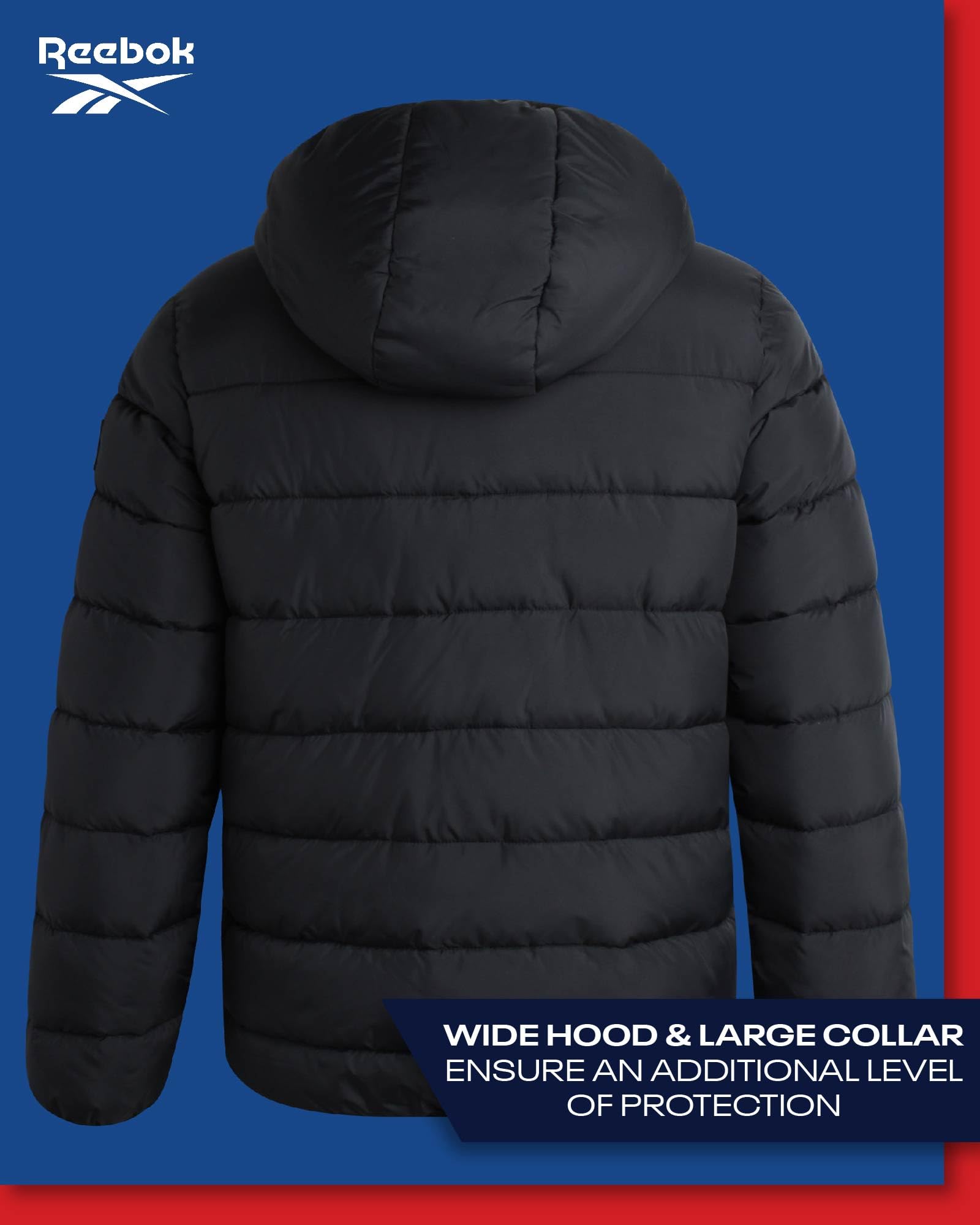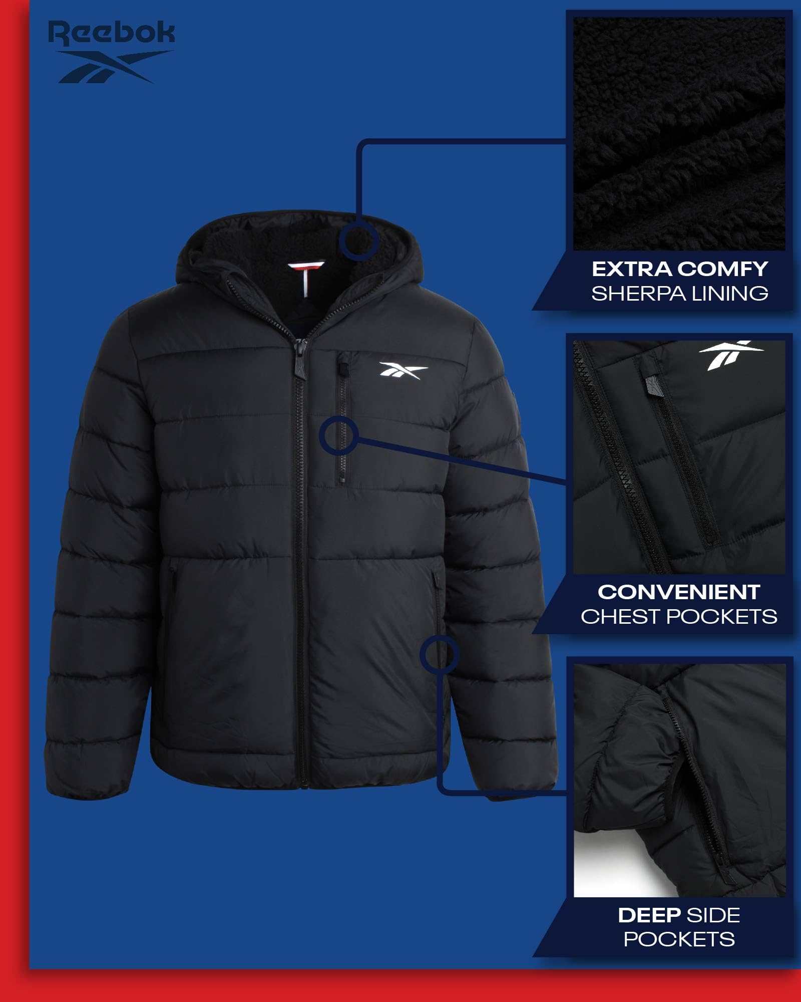 Details: Reebok Men's Winter Jacket - Heavyweight Quilted Windbreaker Puffer Parka Coat - Sherpa Lined Ski Jacket for Men is a great choice for every fashionable man when the temperature drops. Stay comfortable on chilly days with an extra warm and stylish puffer parka coat, designed with fashion and comfort in mind. Featuring deep side pockets to protect your hands from the cold and extra warm sherpa lining for maximum comfort, this stylish outerwear is perfect for work, campus, school, going to the mall, traveling, or having fun on the slope. GREAT INSULATION: You will stay on top of winter weather without being too bulky while the comfy wide hood, sherpa lining, and large collar will make your life so much easier during the unpredictable fall and winter seasons. SOFT AND COMFY: Go from chilly to comfy in seconds. This winter jacket is sherpa-lined and helps adapt perfectly to the weather outside and keeps you warm and stylish every day. DURABLE MEN'S JACKET: Whether hanging out on a cold day or having fun in the snow with family and friends, you won't have to worry about ripping and fading. The durable fabric will last through all your outdoor adventures and winter activities. WINTER COAT: Our water and wind-resistant winter parka coat for men delivers proper protection against the elements, while the high-quality materials guarantee maximum warmth and comfort throughout the day. EASY TO CLEAN: Simply machine wash and tumble dry; Please Reference the Variations for All Available Sizes & Colors! Reebok Offers Premium Clothing because we value every customer that visits our listings! Stop by Our Storefront to See the Rest of Our Great Deals; we're confident you're going to find items that anyone who needs a gift will absolutely love and adore!