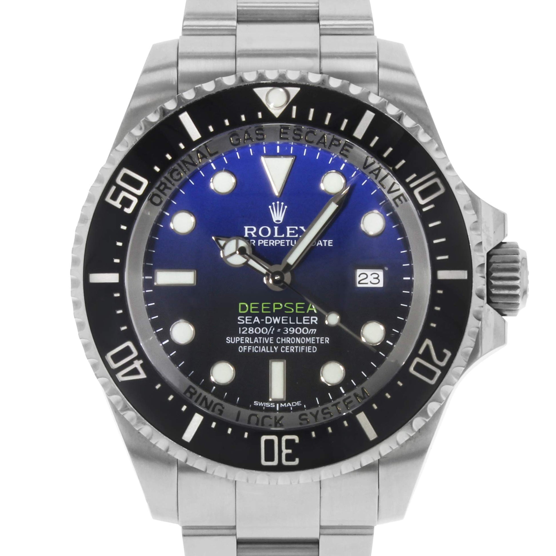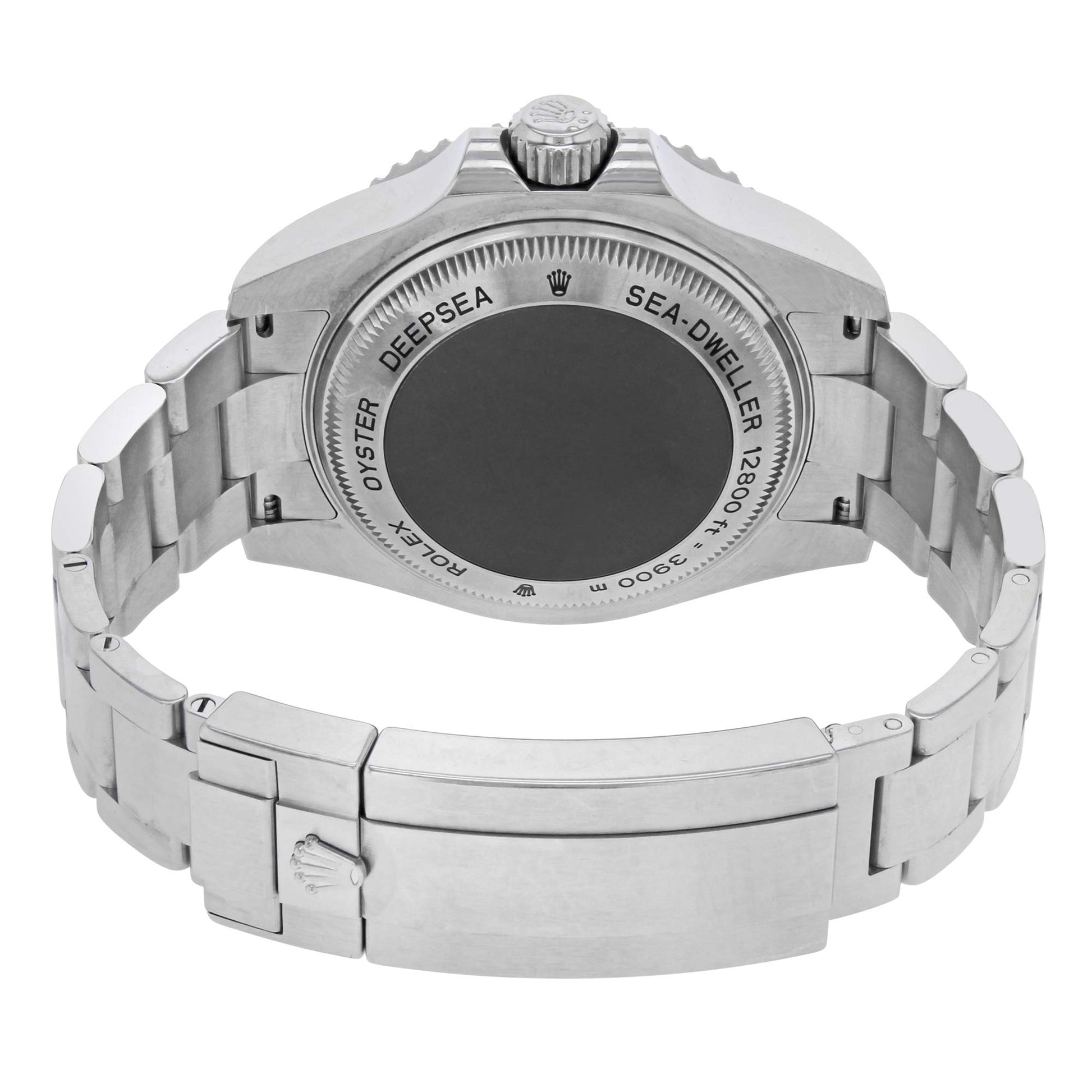 Details: Stainless steel case with a stainless steel oyster bracelet. Uni-directional rotating stainless steel bezel with black top ring. Deep blue dial with luminous hands and dot hour markers. Minute markers around the outer rim. Dial Type: Analog. Luminescent hands and markers. Date display at the 3 o'clock position. Automatic movement. Scratch resistant sapphire crystal. Screw down crown. Solid case back. Case diameter: 44 mm. Round case shape. Oysterlock clasp. Water resistant at 3900 meters / 12800 feet. Functions: date, hour, minute, second. Luxury watch style. Watch label: Swiss Made. Rolex Deepsea Deep Blue Dial Stainless Steel Men's Watch