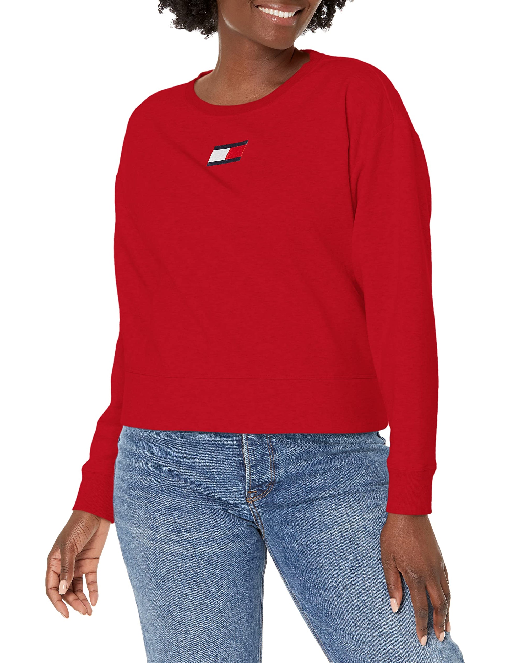 Tommy Hilfiger Women's Long Sleeve Logo Pullover Sweatshirt, Scarlet, Large